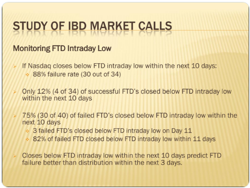 Vấn đề đáng lo ngại lúc này là chỉ số Nasdaq đang quay trở lại sát mức đáy thấp nhất của ngày FTD vào ngày thứ hai. Nhà đầu tư cần lưu ý về khả năng thất bại của ngày FTD nếu đáy thấp nhất của ngày này bị phá thủng. Theo một thống kế từ một số môn đệ O’Neil, nếu Nasdaq thấp hơn đáy thấp nhất ngày FTD trong 10 ngày tiếp theo thì có xác suất 88% sẽ thất bại.