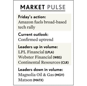 Các cổ phiếu công nghệ (Tech) đang dẫn đầu đợt tăng giá này, chủ yếu là Amazon.com (AMZN),Trái ngược với Facebook, Amazon làm ăn khấm khá hơn trong quý 4. Mức tăng giá 13.5% của cổ phiếu Amazon xuất hiện ngay sau báo cáo quý 4 được công bố, với doanh số tăng 9% lên mức 137 tỷ đôla, nhưng bộ phận điện toán đám mây, Amazon Web Services, tăng gần 40% lên mức 17.78 tỷ đôla doanh số..