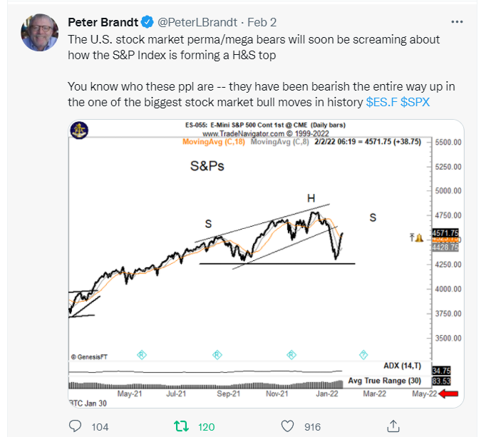 Trong khi đó, Thánh Peter Bandt, một trong những nhà giao dịch theo mẫu hình nổi tiếng ở Mỹ đang cảnh báo khả năng xuất hiện mẫu hình Vai Đầu Vai ở SP500.