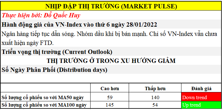 Chỉ số VN-Index tăng giá 0.5% với khối lượng lớn hơn phiên hôm trước, tuy nhiên điều này vẫn chưa đủ điều kiện để đáp ứng cho một ngày Bùng nổ theo đà (FTD). Chỉ số VN-Index đang bị kẹp giữa MA20 ngày và MA50 ngày, đợt nỗ lực hồi phục đi kèm khối lượng thấp đang mang lại nhiều rủi ro hơn là cơ hội.
