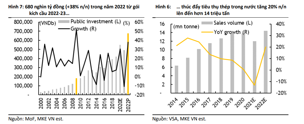 CTCK Kimg Eng và Hiệp Hội Thép (VSA) dự báo sản lượng tiêu thụ thép trong nước năm 2022 có thể tăng 15%-20%, lên hơn 14 triệu tấn thép, nhờ các chương trình kích cầu.