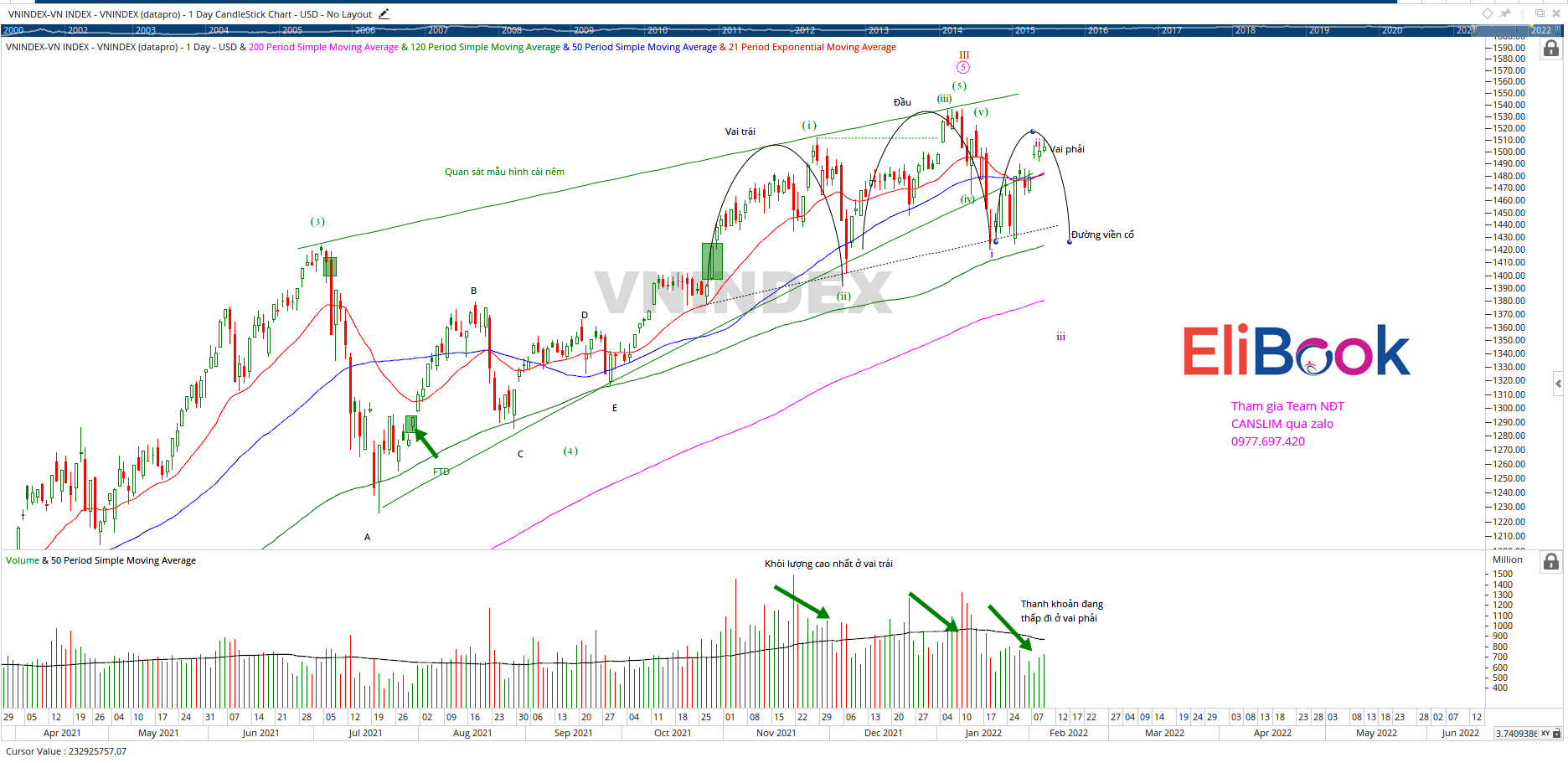Trong khi đó, chỉ số VN-Index vẫn đuối trước vùng kháng cự 1505-1510, ngang với đỉnh vai bên trái hồi tháng 11.2021, khi quan sát mẫu hình vai đầu vai.