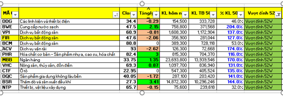 Danh sách vượt đỉnh 52 tuần vẫn chỉ có vỏn vẹn 13 cổ phiếu tham gia vào danh sách này. Ngân hàng, bất động sản. nước, vận tải, thủy sản, dầu khí đang là các ngành có cổ phiếu góp mặt trong danh sách này.