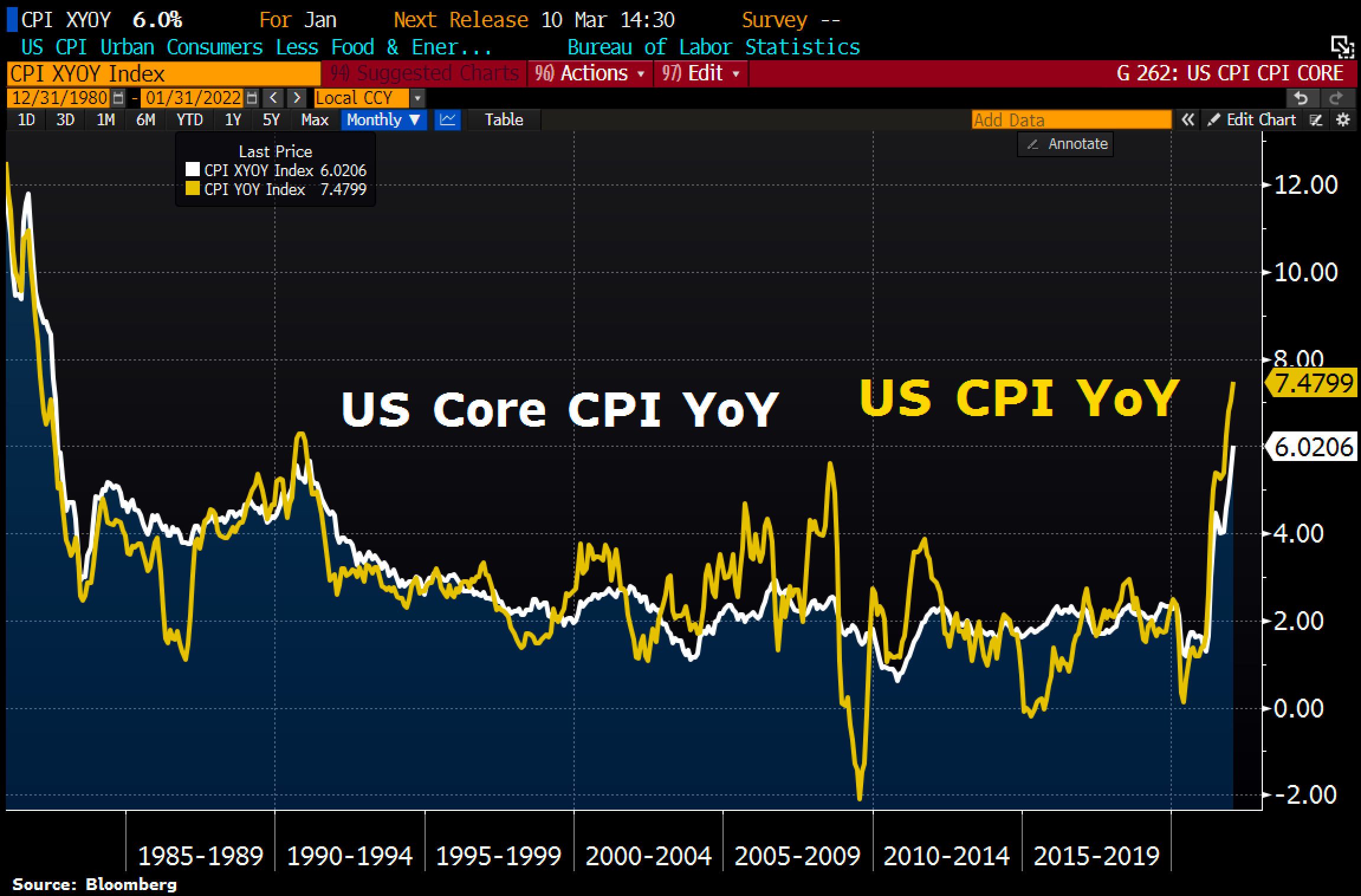 Vào đầu ngày thứ năm, chỉ số CPI được công bố cao hơn dự kiến của các nhà phân tích trong tháng 1, khi cả CPI và Core CPI (loại trừ thực phẩm và năng lương), chạm mức cao nhất 39 năm. Theo đó, CPI tăng 0.6% so với tháng trước và 7.5% so với cách đây một năm, là mức tăng mạnh nhất kể từ tháng 2 năm 1982, theo Bộ Lao Động cho biết.
