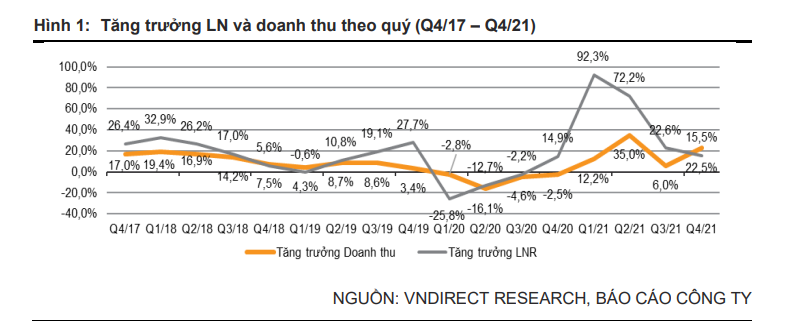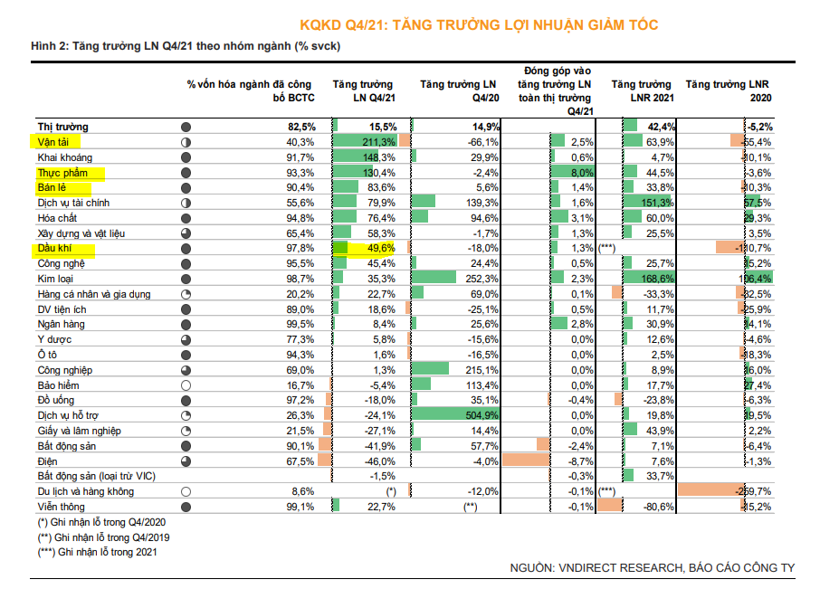 Theo dữ liệu của CTCK VNDirect, tính đến ngày 09/02/2021, đã có 768 công ty niêm yết trên cả ba sàn, chiếm 82.5% giá trị vốn hóa thị trường đã công bố báo cáo tài chính quý IV. Theo đó, lợi nhuận ròng chỉ tăng +15.5%. thấp hơn 22.6% trong quý 3.2021. Biên lợi nhuận gộp của toàn thị trường (trừ ngân hàng) giảm trong quý IV chủ yếu do biên lợi nhuận gộp của thép, bán lẻ, đồ uống và bất động sản giảm.