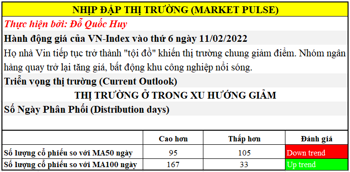 Chỉ số VN-Index giảm giá 0.34% với khối lượng thấp hơn phiên hôm trước. Đường MA50 ngày đang ngày càng phẳng cho thấy thị trường hiện tại chưa có xu hướng (trend) rõ ràng. Ngày thứ 9 của đợt nỗ lực hồi phục vẫn chưa có sự xuất hiện của ngày Bùng nổ theo đà (FTD). Sự xuất hiện ngày càng trễ của ngày FTD cảnh báo về một đợt nỗ lực hồi phục thất bại của thị trường.