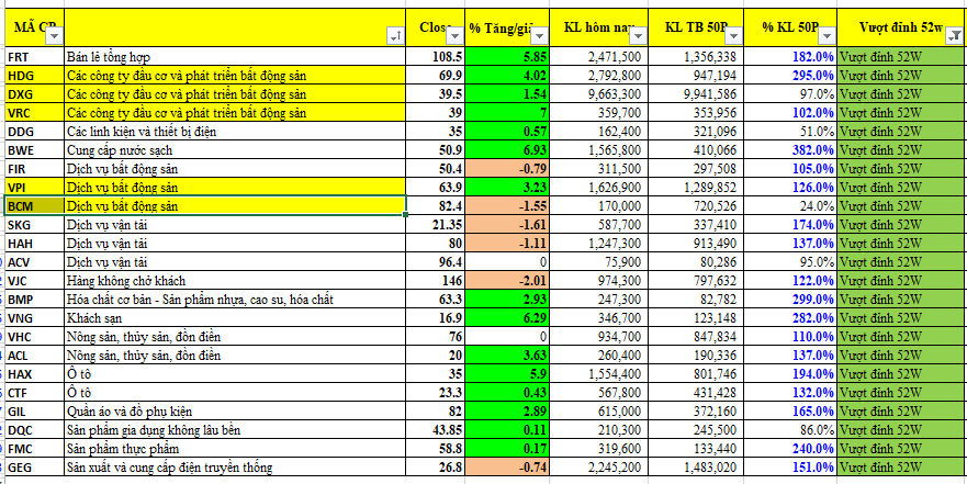 Danh sách các cổ phiếu vượt đỉnh 52 tuần cho thấy sóng ngành đang tập trung ở: Bất động sản, vận tải (cảng biển, logistic, du lịch dịch vụ), và lĩnh vực hàng tiêu dùng (cả thiết yếu và không thiết yếu)