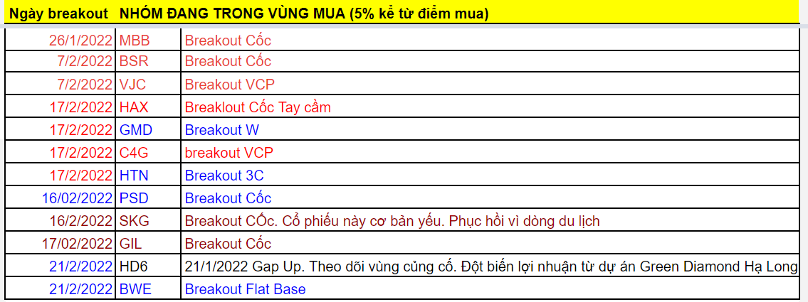 Trong bối cảnh này, nhà đầu tư nên tiếp tục theo dõi chất lượng các điểm breakout để xem mức độ hoạt động của thị trường. Sự đi ngang của thị trường khiến các điểm breakout không hoạt động tốt trong thời gian gần đây. Từ tháng 11 đến tháng 1.2022 (trước tết âm lịch), các điểm breakout đa phần thuộc về nhóm Dầu Khí và Ngân Hàng. Tuy nhiên, các cổ phiếu phần lớn không thể tăng giá kéo dài sau điểm breakout.