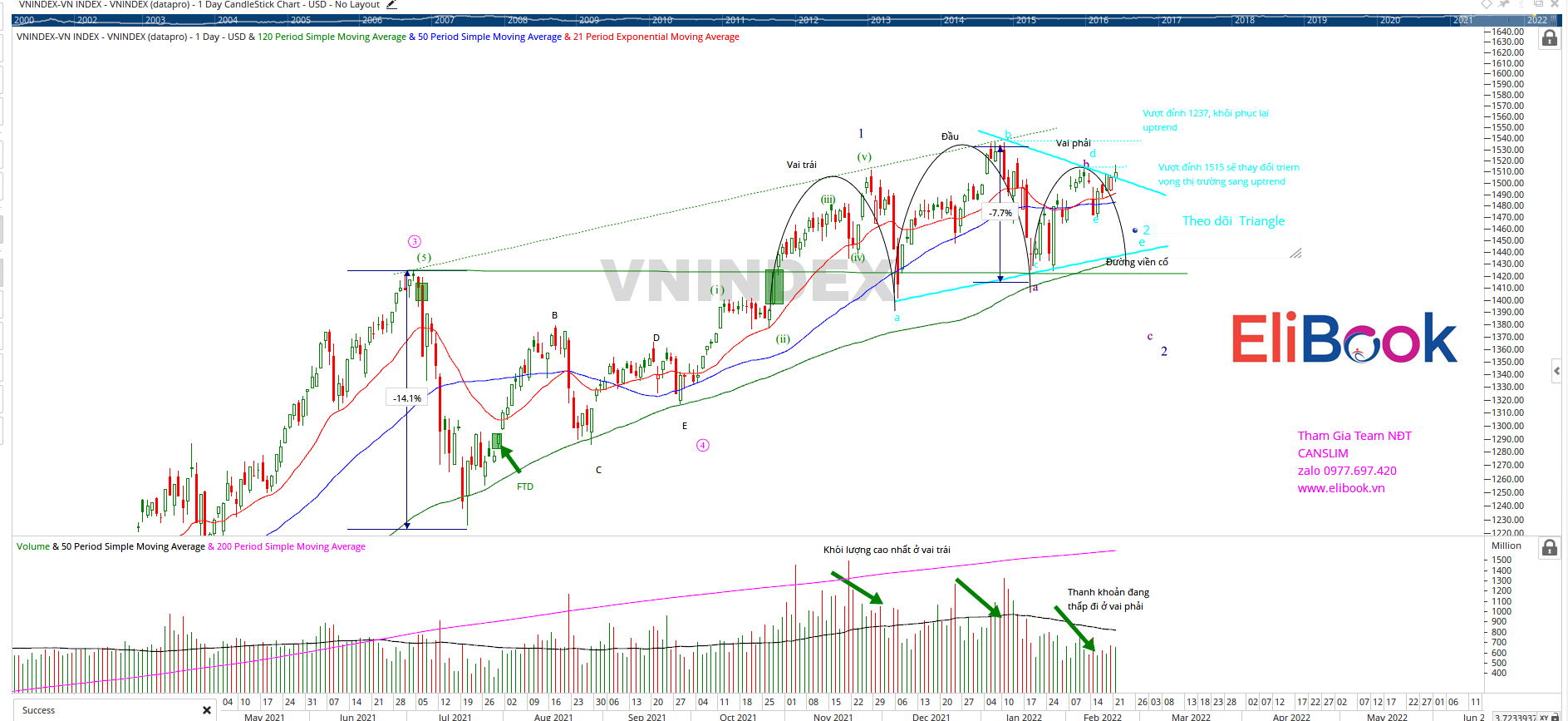 TTCK Việt Nam ngược lại, đang cố gắng vượt mức kháng cự 1515 điểm, từng là đỉnh hồi tháng 11.2021, và đang tạo nên sự hồi phục sau đáy ngày 25/1/2022. Như bản tin Nhịp Đập Thị Trường ngày 17.2.2022 cho biết, Team NĐT CANSLIM đamg xem xét thay đổi triển vọng thị trường chứng khoán (xem lại tại đây: