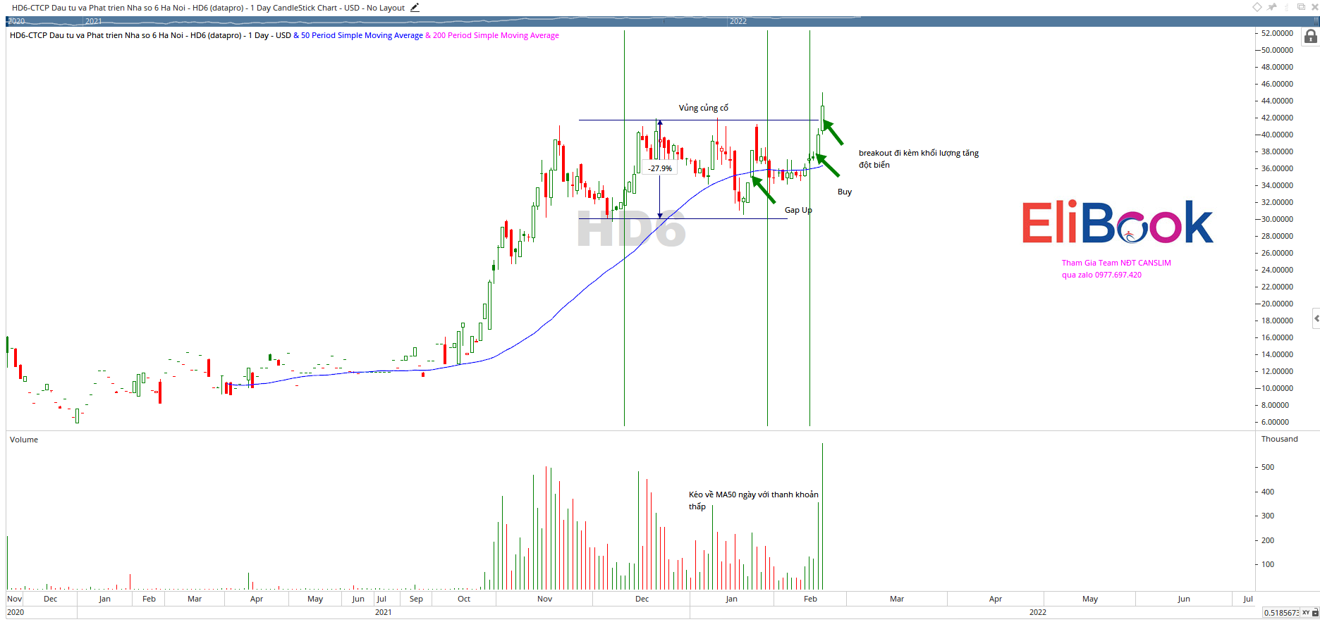 Cổ phiếu HD6 +11%, và có điểm breakout nền giá kiểu Vùng Củng Cố, đồng thời vượt ra khỏi vùng mua hợp lý. ASM +2.27% sau điểm mua Pocket Pivot vào ngày 16/2/2022. LHG +2.25% và có điểm mua Pocket Pivot. Cả ba cổ phiếu này đều nằm trong Watchlist theo dõi của Team NĐT CANSLIM từ lâu và các báo cáo phân tích chi tiết đã gửi đến các nhà đầu tư.