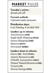 Rốt cuộc, chỉ số Nasdaq lại có thêm một ngày phân phối (là phiên cho thấy sự bán ra của dòng tiền tổ chức). Trên sàn Nasdaq, khối lượng tăng 8% lên mức 4.81 tỷ cổ phiếu, cao hơn so với ngày thứ sáu tuần trước, mặc dù phiên đó là ngày chốt hợp đồng quyền chọn cổ phiếu và chỉ số của tuần và tháng.