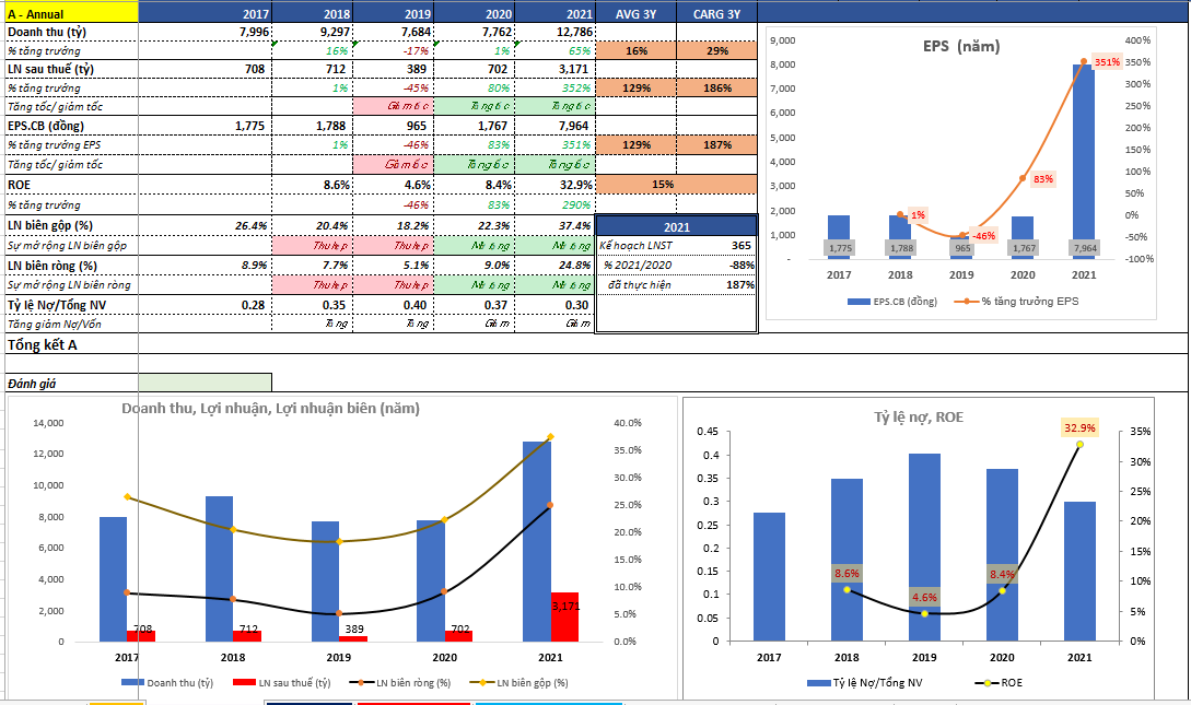 Lũy kế cả năm 2021, lợi nhuận của DPM đạt 3,171 tỷ, tăng +352%. Doanh số cũng tưng trưởng +65% và biên lợi nhuận gộp được mở rộng lên 37.4%. Như vậy, DPM đang đạt cả chữ C và A