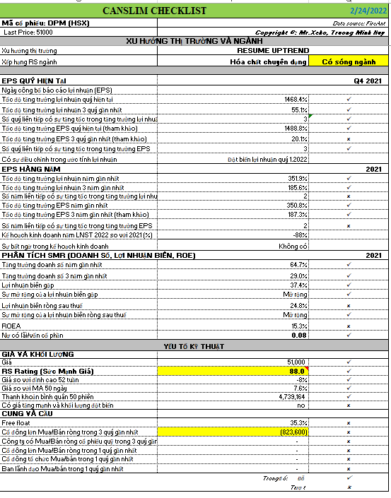 Bảng CANSLIM Checklist cho thấy DPM đang đạt gần như phần lớn các tiêu chí quan trọng trong CANSLIM. Tuy nhiên, thận trọng rằng đây là cổ phiếu mang tính chu kỳ, đỉnh lợi nhuận có thể trùng với đỉnh giá chứng khoán.