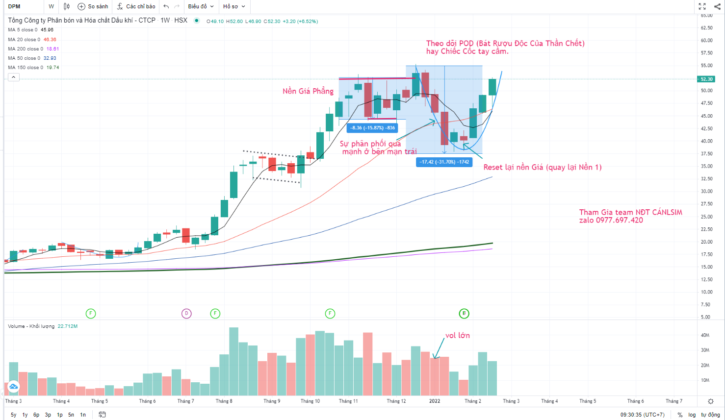 Trên đồ thị giá của DPM, chúng tôi đang theo dõi khả năg POD (Bát Rượu Độc của Thần Chết) hoặc có thể là Chiếc Cốc Tay Cầm. Do bị phân phối khá mạnh trong tháng 12.2021 nên mạn trái của Chiếc Cốc bị lỗi. Nhà đầu tư cần cảnh giác với khả năng nền giá bị lỗi. Hiện, DPM đã phá thủng đáy Nền Giá Phẳng trước đó và tiến hành Reset lại toàn bộ Nền Giá.