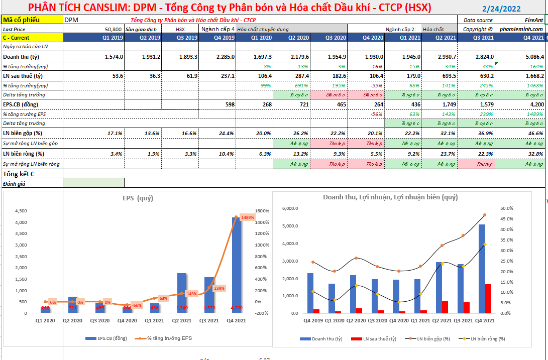 Năm 2021 là năm thành công rực rõ đối với DPM. Trong quý 4, 2021, DPM công bố doanh thu đạt 5086 tỷ đồng và lợi nhuận sau thuế đạt 1668.2 tỷ đồng, lần lượt tăng 164% yoy và 1468% yoy. DPM có code 33 của phù thủy Mark Minervini trong cuốn sách ‘Giao dịch như một phù thủy chứng khoán” khi liên tiếp 5 quý có sự tăng tốc trong tăng trưởng doanh thu, lợi nhuận và biên lợi nhuận gộp mở rộng.