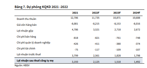 Kế hoạch kinh doanh 2022 của DPM khá thận trọng với doanh thu đạt 11.058 tỷ, giảm nhẹ -14% so với năm ngoái. LNST chỉ còn 945 tỷ đồng, giảm mạnh -68% so với năm ngoái. CTCK KB dự phóng doanh thu năm 2022 đạt 11,735 tỷ đồng, giảm 8.9% và LNST đạt 2.125, giảm 33%. Việc DPM đã bảo dưỡng nhà máy trong năm 2021 nên sẽ không có bảo dưỡng lớn trong năm 2022. Dự phóng của KB cho thấy khả năng DPM đã đạt tới đỉnh lợi nhuận và sẽ có sự sụt giảm lợi nhuận trong các năm tiếp theo. Do đó, chúng tôi thấy DPM nghiêng về khả năng cổ phiếu chu kỳ hơn là tăng trưởng thực sự.