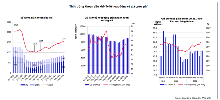 Số lượng dàn khoan dầu khí đang hoạt động vẫn ở mức rất thấp so với những năm 2019. Trên đồ thị dễ dàng nhận thấy giá cho thuê dàn khoan và tỷ lệ hoạt động của giàn khoan JU tại thị trường Mỹ đang có xu hướng hồi phục nhẹ trở lại từ đầu năm 2021.