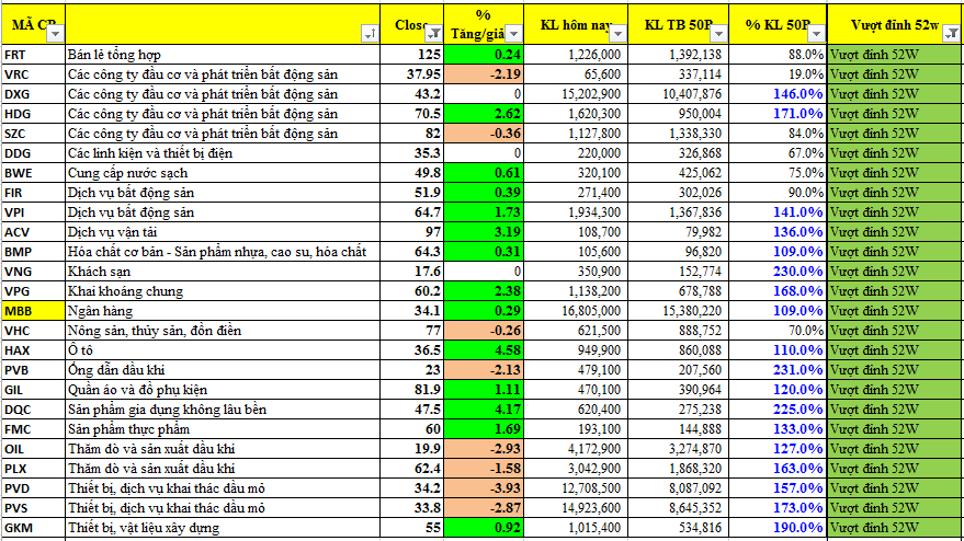 Danh sách cổ phiếu vượt đỉnh thu hẹp nhẹ lại còn 25 cổ phiếu, giảm 3 cổ phiếu so với phiên giao dịch trước đó. Nhóm điện, nước, ô tô, hàng không, thủy sản, hàng tiêu dùng , bất động sản và dầu khí đang là những nhóm có số lượng cổ phiếu tham gia vào danh sách vượt đỉnh nhiều nhất.