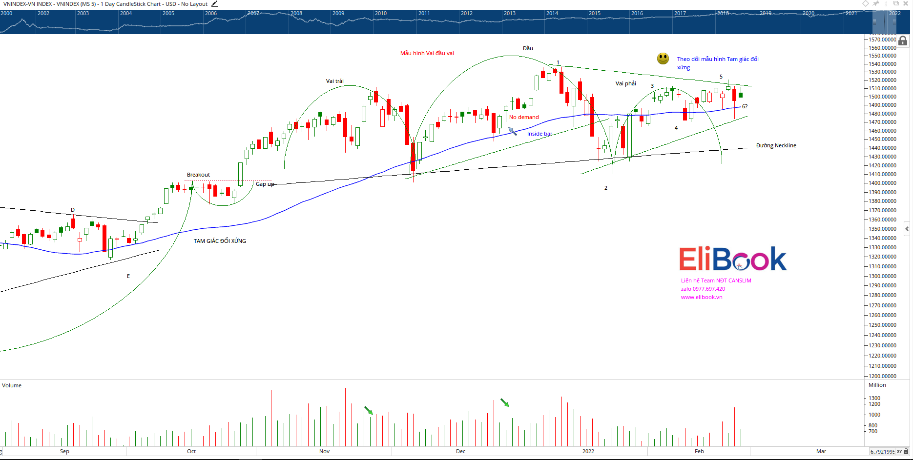 Mẫu hình Vai đầu vai vẫn được chúng tôi tiếp tục theo dõi song song với mẫu hình Tam giác đối xứng đang hình thành trên chỉ số VN-Index. Chúng tôi kỳ vọng với sự giúp sức của nhóm ngân hàng, chỉ số VN-Index sẽ breakout thành công mẫu hình Tam giác đối xứng và tiến tới một Uptrend mới trong năm 2022.