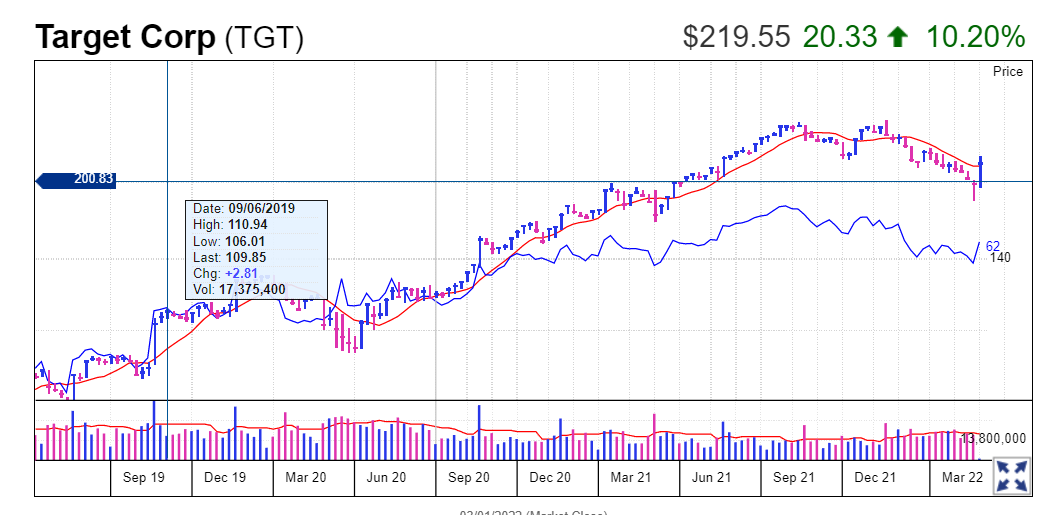 Target (TGT) vừa thông báo kết quả kinh doanh theo quý rất tốt (lợi nhuận tăng 19% so với tháng 1, và EPS tăng trưởng 58% so với cùng kỳ năm ngoái). Cổ phiếu blue chip ngành bán lẻ này đã bật tăng trở lại lên trên MA50 ngày lần đầu tiên sau gần ba tháng.