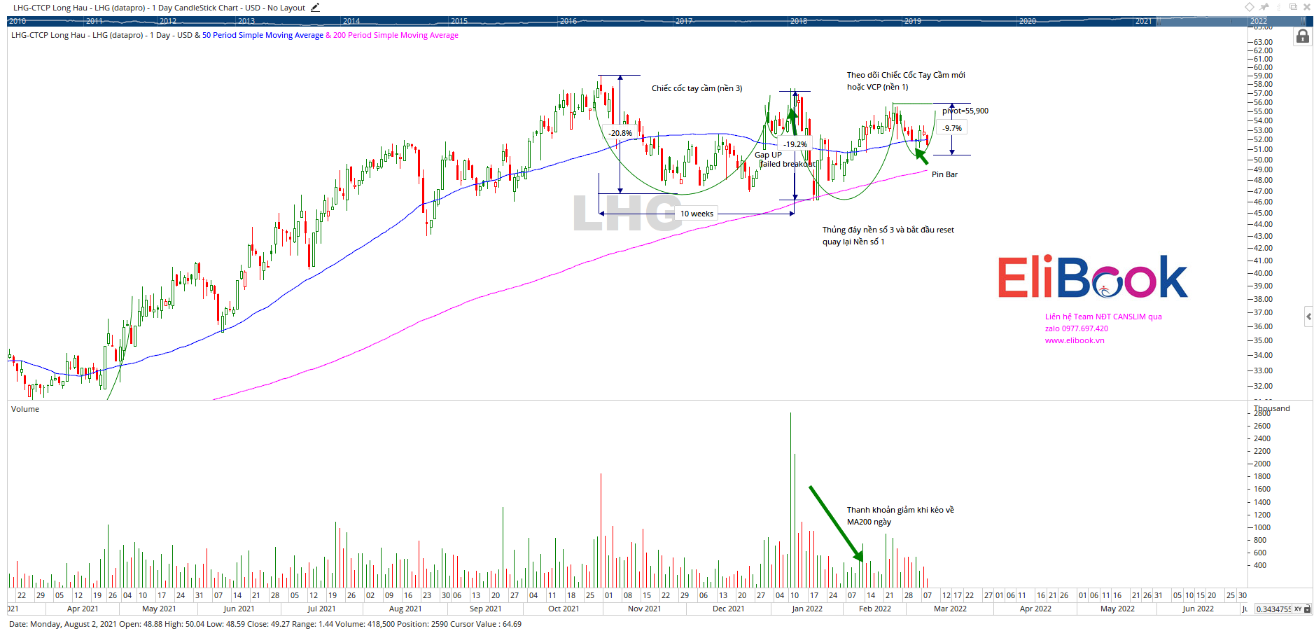 Trên đồ thị, cổ phiếu LHG đang hình thành mẫu hình Chiếc Cốc Tay Cầm.