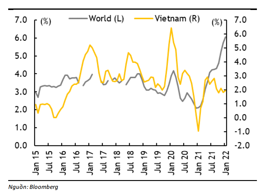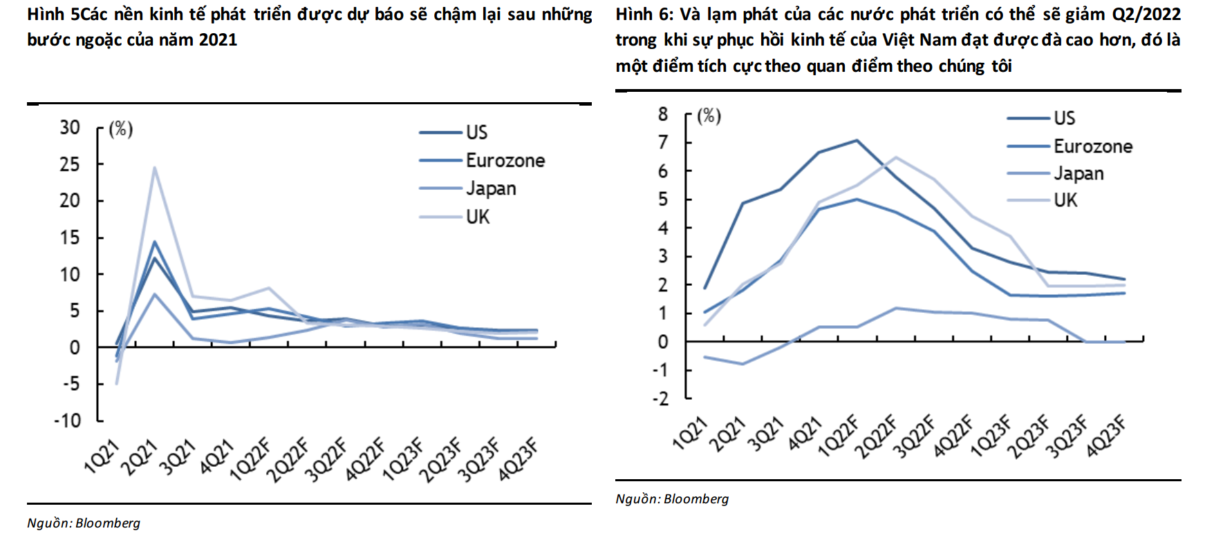 - Theo khảo sát của Bloomberg, lạm phát của các nước phát triển sẽ giảm xuống từ Quý 2/2012 khi nền kinh tế của các nước này, đặc biệt là Mỹ, đang chậm lại và các điểm nghẽn về nguồn cung đang được giải quyết. Từ quan điểm lạm phát, điều này thực sự có thể có lợi cho sự phục hồi của nền kinh tế Việt Nam, có thể sẽ đạt được đà cao hơn trong Q2/2022.