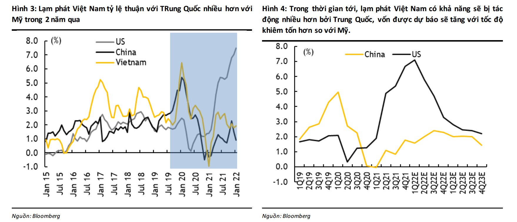 - Lạm phát của Việt Nam tỷ lệ thuận với Trung Quốc nhiều hơn so với Mỹ trong hai năm qua do (1) Trung Quốc là đối tác thương mại lớn nhất của Việt Nam (Trung Quốc chiếm 27% tổng kim ngạch thương mại năm 2021 so với 17% của Mỹ ) và (2) VN và TQ đã áp dụng các chiến lược “Zero Covid” tương tự trong giai đoạn 2020-21 và do đó có cùng giai đoạn phục hồi kinh tế. Và theo khảo sát của Bloomberg, lạm phát Trung Quốc được dự báo sẽ ở mức vừa phải đạt 2.2% (thấp hơn năm 2020) do thị trường bất động sản nước này suy yếu.