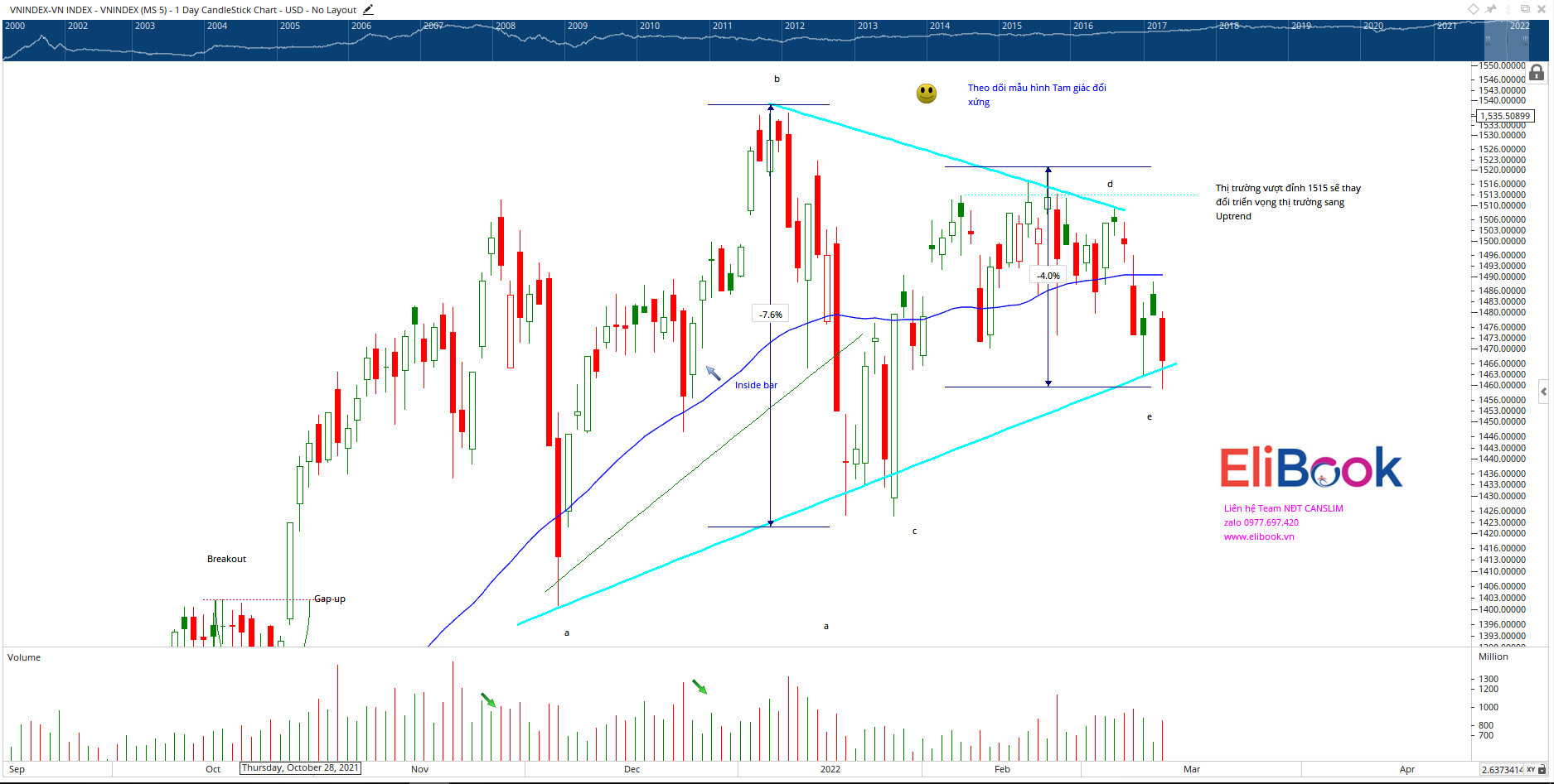 Chỉ số VN-Index đóng cửa ở mốc 1,466.54, giảm 0.85%. HNX-Index giảm giá 0.68%, cả hai chỉ số đều có ngày giảm giá với khối lượng cao hơn phiên hôm trước. Chỉ số VN30 giảm 0.88% và đang nhận được hỗ trợ tại vùng hỗ trợ 1,464 được hình thành vào tháng 12/2021.