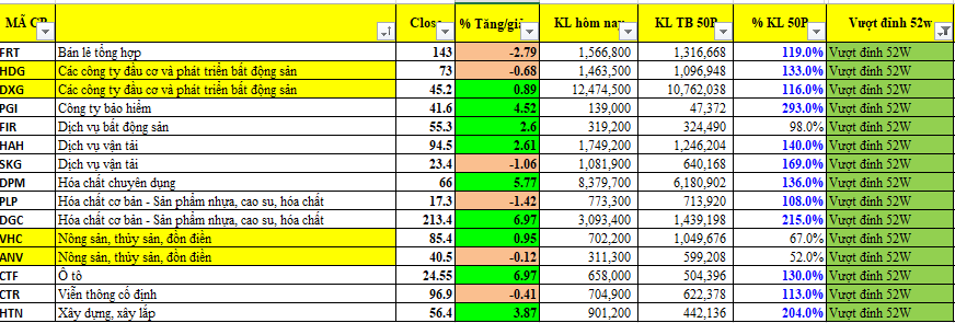 Số lượng cổ phiếu vượt đỉnh 52 tuần ngày hôm nay là 15 mã cổ phiếu, nhiều hơn 3 mã cổ phiếu so với ngày thứ hai.