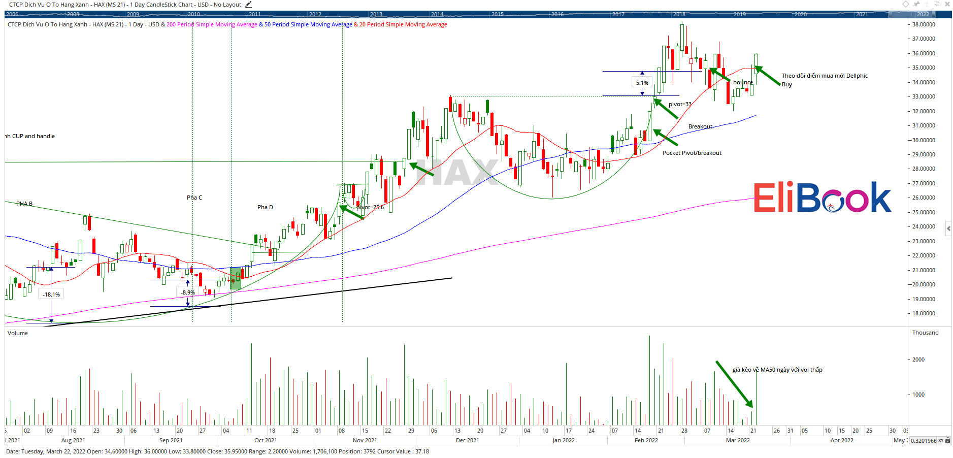 Cổ phiếu HAX +6.2% và đóng cửa ở mức cao nhất phiên, hình thành điểm mua Dellphic Buy. Điều này giúp Team NDT CANSLIM tiếp tục khuyến nghị khách hàng trong room zalo (0977.697.420)mua vào để tăng quy mô vị thế. HAX đã có điểm breakout mẫu hình Chiếc Cốc vào ngày 18/2/2022. Sau điểm mua Dellphic Buy, HAX đã rời khỏi vùng mua hợp lý và không nên tiếp tục mua rượt đuổi nữa.