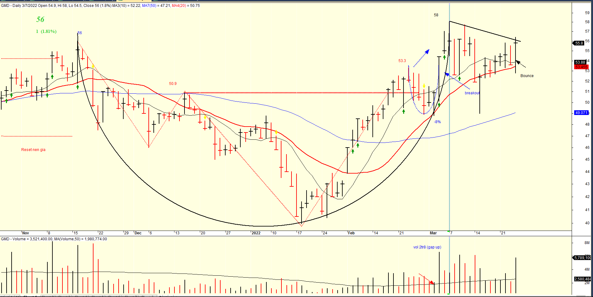 Cổ phiếu mạnh là cổ phiếu đi ngược lại với thị trường chung. Trong ngày mà cả thị trường chìm trong sắc đỏ thì nhóm cổ phiếu bán lẻ và cảng biển lại càng nổi bật hơn với sắc xanh của mình. Cổ phiếu cảng biển được Team NĐT CANSLIM nắm giữ GMD có ngày bật tăng mạnh với khối lượng lớn ngay tại MA20 ngày. Cổ phiếu đang xây lại phần tay cầm của mẫu hình Chiếc Cốc tay cầm lớn. Nhà đầu tư có thể mở mua khi GMD breakout mẫu hình Chiếc Cốc tay cầm với điểm pivot mới 58 trong các phiên tiếp theo. Khối lượng cạn kiệt tại phần tay cầm đem đến hành động giá kiến tạo cho cổ phiếu GMD.