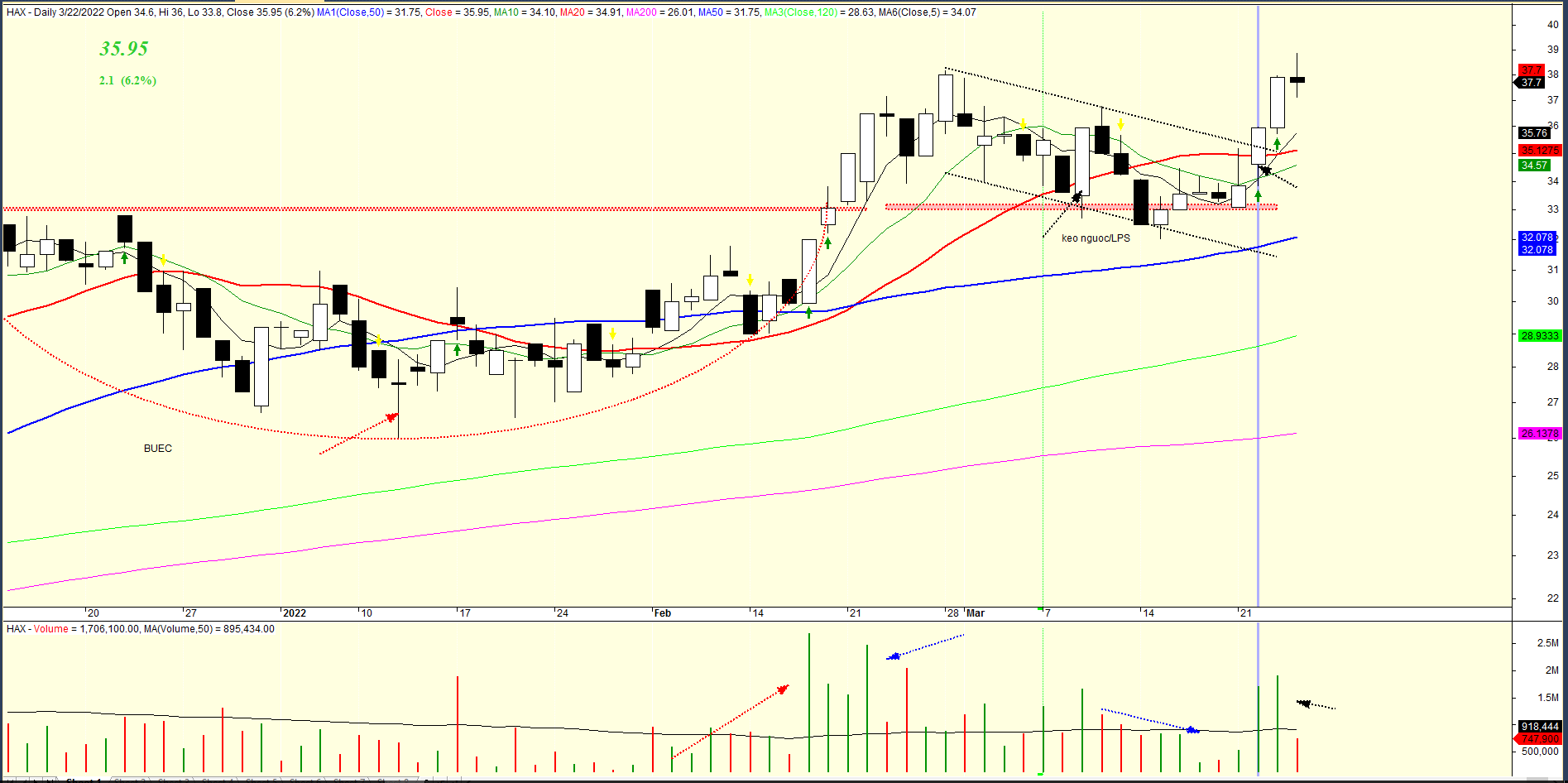 Nhóm cổ phiếu hàng tiêu dùng không thiết yếu như HAX tăng giá thiết lập đỉnh cao mới trong phiên nhưng sau đó bị kéo giảm nhẹ trở lại do sự ảnh hưởng của thị trường chung. Cổ phiếu hiện tại đã rời xa vùng mua hợp lý sau khi breakout thành công mẫu hình Kênh giá dốc xuống với khối lượng lớn. Nhà đầu tư cần tránh mua đuổi ở cổ phiếu này sau khi HAX đã tăng 7% từ điểm breakout mẫu hình.