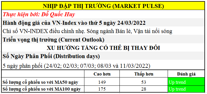 Độ rộng thị trường được mở rộng mạnh sau phiên giao dịch 24/03/2022. Số lượng cổ phiếu nằm trên MA50 ngày đang chiếm số lượng áp đảo (gấp ba) số lượng cổ phiếu nằm dưới MA50 ngày.