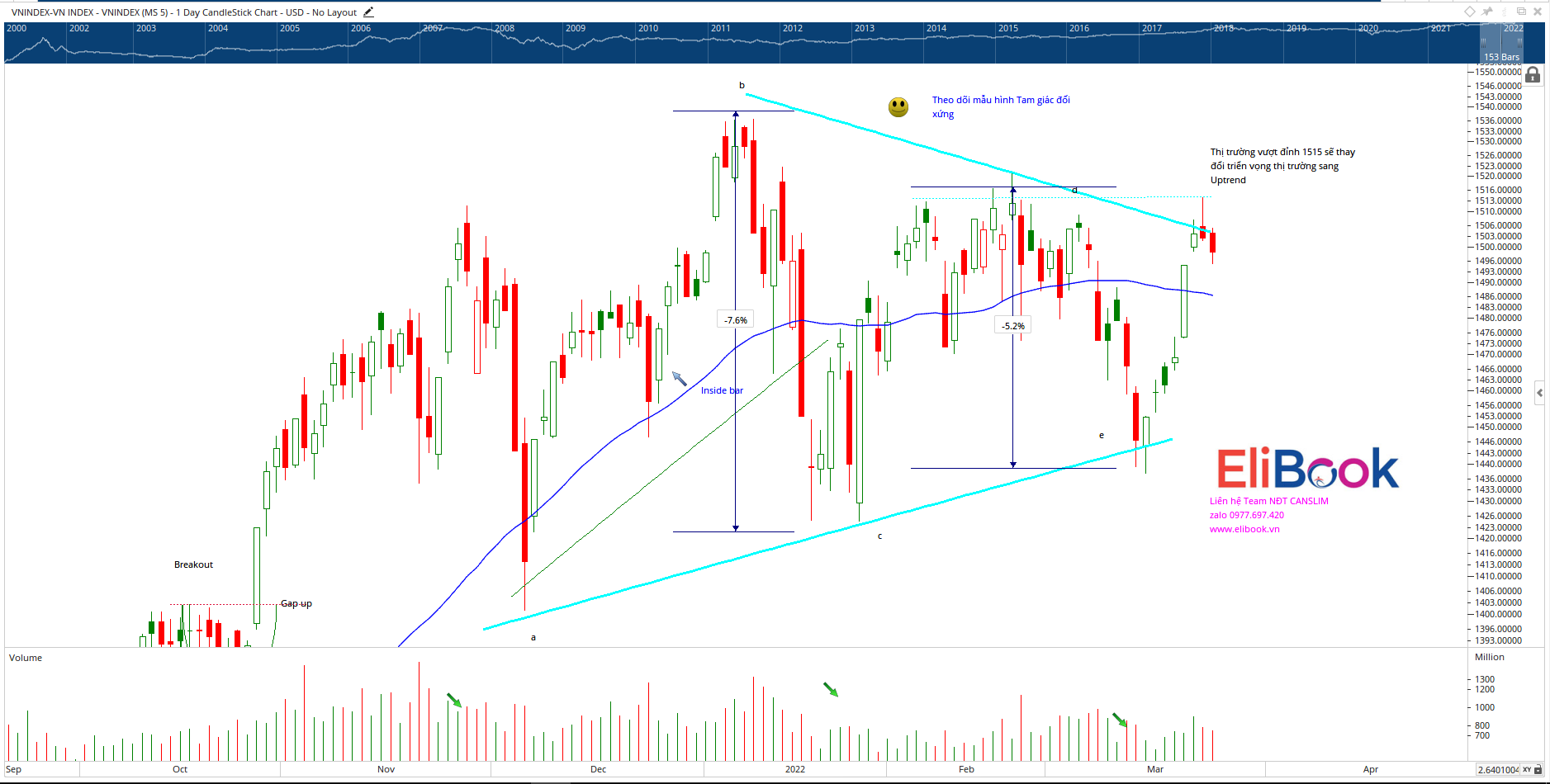 Theo quan sát của chúng tôi, chỉ số VN-Index đang lùi lại lấy đà cho cú tăng tốc sắp tới. Sau khi chạm vào vùng kháng cự 1,515 điểm được hình thành vào tháng 2 trước đó (đây là vùng kháng cự khá cứng), chỉ số VN-Index đã điều chỉnh nhẹ nhàng trở lại để lấy đà bứt tốc cho nhịp tăng giá tiếp theo.