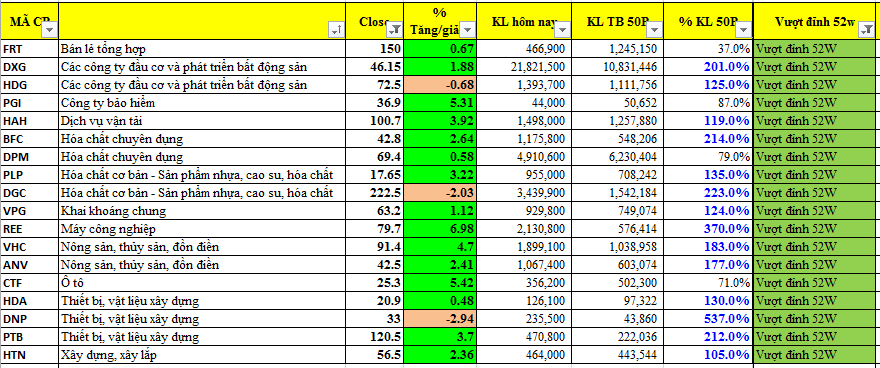 Danh sách cổ phiếu vượt đỉnh tăng lên 18 cổ phiếu, cao hơn 2 cổ phiếu so với phiên hôm qua. Nhóm vận tải, bất động sản, xây lắp và hàng tiêu dùng đang là các lĩnh vực dẫn dắt trong bối cảnh hiện tại. Sóng ngành Ngân hàng được Team NĐT CANSLIM kỳ vọng sẽ “tỏa sáng” mạnh mẽ trong thời gian tới cùng với nhóm dầu khí.