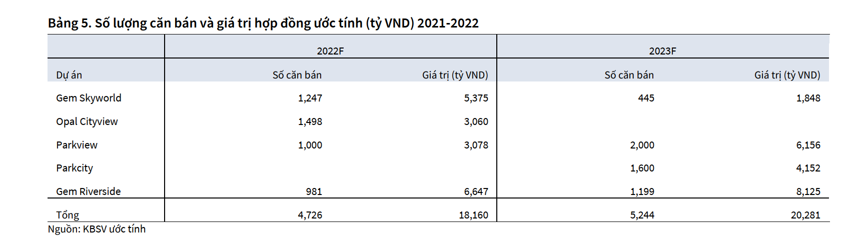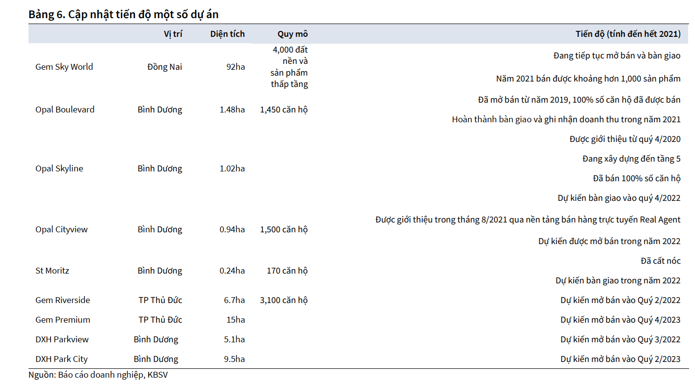 Nguồn thu tiếp tục đến từ dự án Gem Sky World và mở bán 3 dự án mới là Opal Cityview, DXG Parkview và Gem Riverside. Tổng giá trị hợp đồng bán của các dự án trong năm 2022 ước 18,160 tỷ đồng, cao gấp 3 lần năm 2021. Chính việc định giá lại hai dự án Gem Skyword và Gem Riverside, lẫn Gem Premium khiến KB tăng giá mục tiêu.