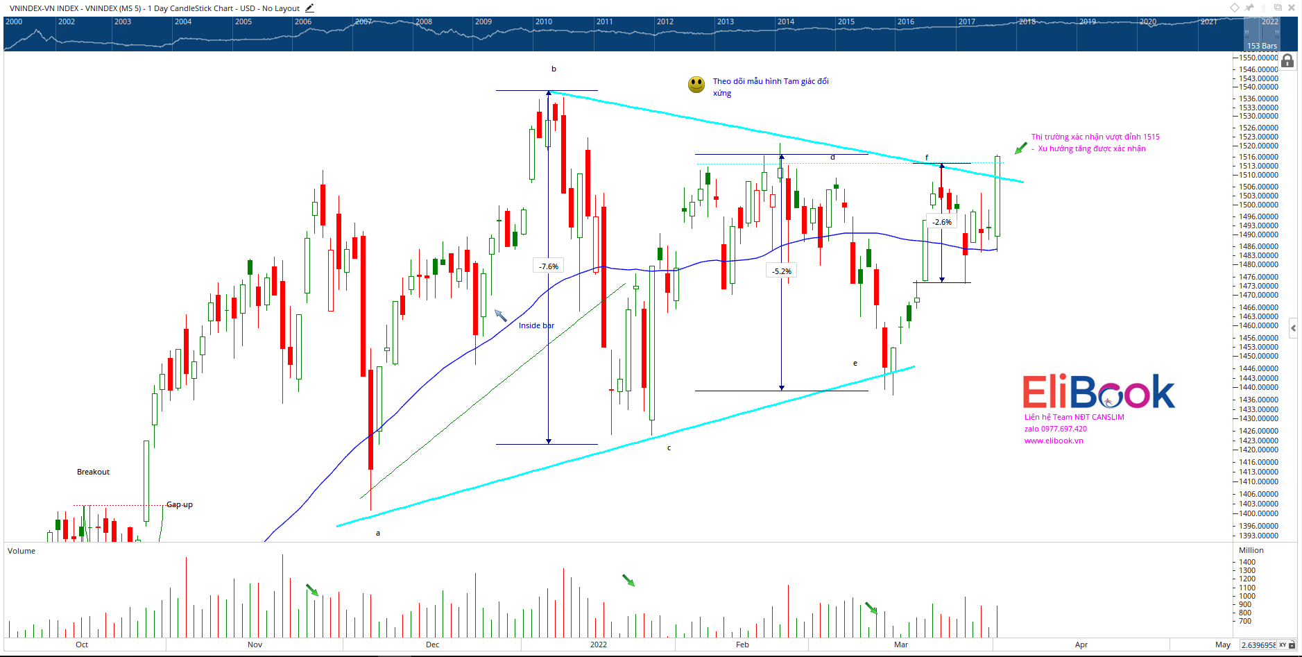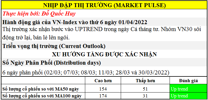 Sau phiên giao dịch hôm nay, thị trường chính thức bước vào một xu hướng tăng mới. Đây là lúc trader tăng cường sự hiện diện của mình trên thị trường. Nhiều nhà đầu tư lo ngại về chiến tranh, lạm phát, bắt bớ cuối cùng cũng đã được giải tỏa bằng ngày tăng giá mạnh của thị trường. Chính ngày tăng giá bùng nổ đã đẩy thị trường vào pha tăng giá mới, công việc của trader là hãy tìm kiếm các cổ phiếu có mẫu hình giá chặt chẽ đi kèm với báo cáo kết quả kinh doanh tích cực trong Quý 1/2022 để tiến hành mua vào.