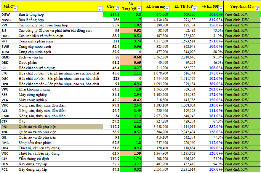 Danh sách cổ phiếu vượt đỉnh giảm nhẹ 1 cổ phiếu so với phiên hôm qua, có tổng cộng 30 cổ phiếu tham gia vào danh sách vượt đỉnh 52 tuần. Sóng ngành bán lẻ, hóa chất, bất động sản, đầu tư công, vận tải, thủy sản và viễn thông đang chiếm ưu thế.