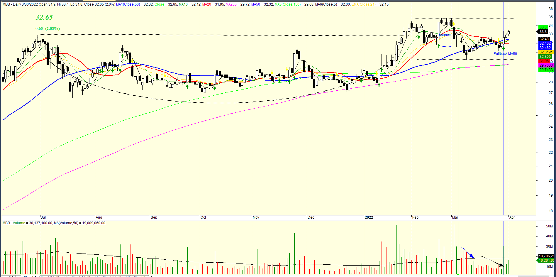 Cổ phiếu MBB sau phiên Pocket pivot cũng đang tiến tới điểm pivot của mẫu hình Nền giá phẳng chồng lên Cốc. Độ sâu nền giá: -14%. Nhà đầu tư có thể tiếp tục mua bổ sung vị thế đối với MBB nếu cổ phiếu này breakout thành công trong các phiên sắp tới. Điểm pivot: 34.9