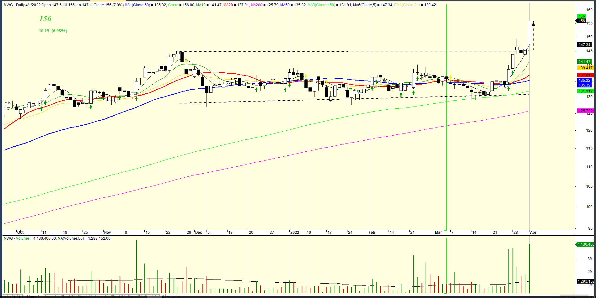Cổ phiếu MWG cũng có phiên đóng cửa tăng trần, breakout và rời xa vùng mua hợp lý của mẫu hình Nền giá phẳng. Nhà đầu tư không nên mua đuổi để tránh bị thua lỗ ở các cổ phiếu tăng giá rời xa vùng mua hợp lý. Như các bảng tin trước, Team chúng tôi đã có đề cập: bán lẻ và vận tải sẽ là hai ngành dự báo sẽ phục hồi mạnh mẽ nhất sau sự ảnh hưởng của hai năm vì dịch bệnh.