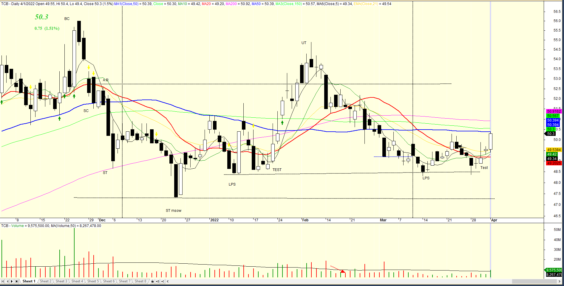 Sau nhiều ngày bị đè nén thì các cổ phiếu ngân hàng cũng có ngày “ngửa mặt lên trời” trong ngày thị trường xác nhận quay trở lại Uptrend. Quan sát các cổ phiếu ngân hàng thì TCB xuất hiện phiên SOSbar sau sự kiện Test ở pha C. Chúng tôi đang theo dõi mẫu hình Cốc đang hình thành trên TCB với điểm pivot: 54.9