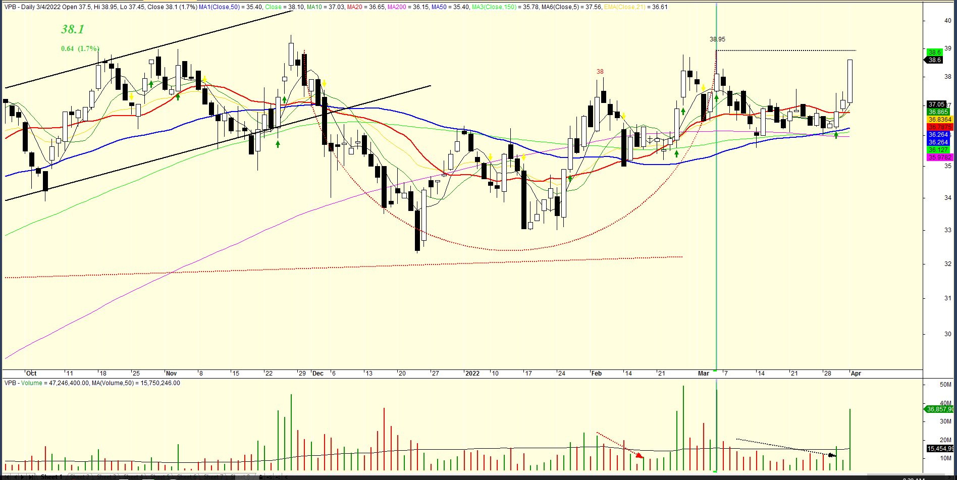 Cổ phiếu VPB cũng có phiên bật tăng mạnh mẽ với khối lượng lớn sau khi nhận được sự hỗ trợ của đường MA50 ngày trước đó. Cổ phiếu đang tiến tới điểm pivot 38.95 của mẫu hình Chiếc Cốc tay cầm. Nhà đầu tư nếu đang có hàng ở cổ phiếu này có thể tiến hành bổ sung vị thế nếu VPB breakout thành công. Nhóm cổ phiếu ngân hàng đã nhiều lần “gạt” nhà đầu tư, đều breakout fail nhưng lần này sẽ là thật.