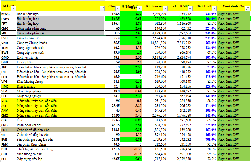 Sóng ngành đang tập trung ở nhóm thủy sản, bán lẻ, công nghệ. Có 31 cổ phiếu vượt đỉnh 52 tuần trong phiên ngày hôm nay.
