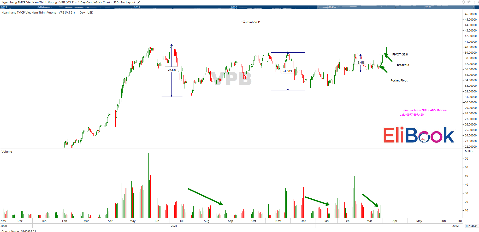 Với mẫu hình Tam Giác Đối Xứng, mục tiêu giá của VN-Index trong vài tháng tới là 1650 điểm. Dòng ngân hàng đã trở lại để nâng đỡ thị trường sau gần 9 tháng tích lũy. VPB là cổ phiếu được Team NĐT CANSLIM khuyến nghị mua trong bản tin tuần. Phiên hôm nay VPB được khuyến nghị nâng tỷ trọng.