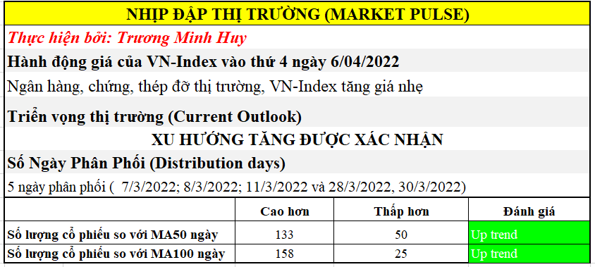 Team NĐT CANSLIM vẫn giữ quan điểm triển vọng thị trường đang ở trong “Xu Hướng Tăng Được Xác Nhận” với 5 ngày phân phối. Tuy nhiên, bối cảnh thị trường hiện tại vẫn có sự phân hóa cao nên buộc nhà đầu tư phải lựa chọn kỹ sóng ngành.