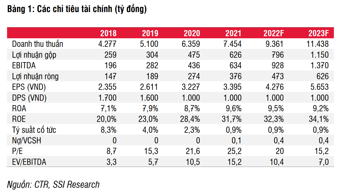 Giờ đây, trong bản báo cáo ngày 5.4.2022, CTCK SSI đưa ra giá mục tiêu 135,900, tăng mạnh so với con số 104,500 vào tháng 1.2022. Theo SSI, "tăng trưởng lợi nhuận trước thuế quý 1.2022 của CTR ước tính tăng 29% yoy. Bên cạnh chờ kế hoạch phát triển 5G, doanh thu mảng xây dựng dân dụng (+40% yoy) trở thành một trong những động lực tăng trưởng của công ty cùng với mảng cho thuê cơ sở hạ tầng viễn thông (+142% yoy). Lãnh đạo CTR cho biết kế hoạch lợi nhuận trước thuế năm 2022 là 653 tỷ đồng (tăng +38%), cao hơn 10% so với ước tính của SSI. Dựa vào tăng trưởng EPS năm 2022/2023 là 25.9%/32.2%, CTR hiện giao dịch ở mức P/E 2022/2023 là 20x/15x. Trong khi đó các công ty cho thuê cơ sở hạ tầng toàn cầu thương có hệ số P/E 2022/2023 lần lượt là 25.5x/22.6x nhưng với mức tăng trưởng EPS thấp hơn 18.1%/10.2%. "