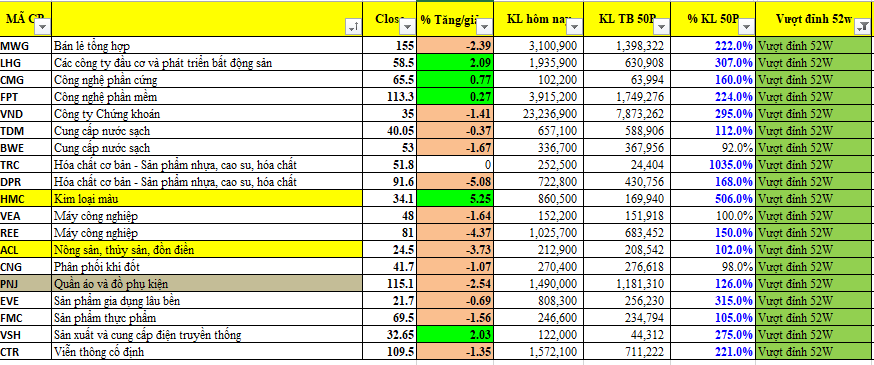 Chỉ còn 19 cổ phiếu vượt đỉnh 52 tuần trong phiên ngày hôm nay, giảm mạnh so với con số 31 của ngày hôm trước.