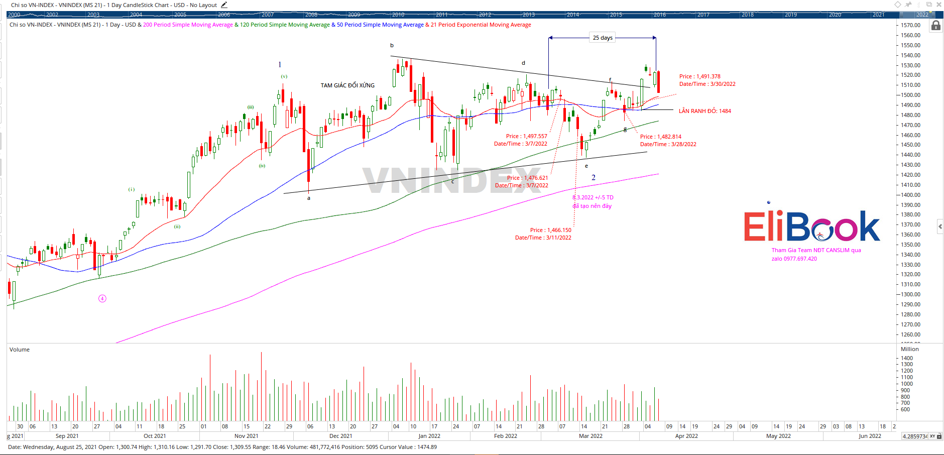 Điều quan trọng là VN-Index có được giữ trên EMA 21 ngày và MA50 ngày (đang dốc lên) hay không. Hai đường di động này lần lượt đang ở mức 1498 và 1491 điểm. Chỉ số VN-Index không nên đóng cửa thấp hơn hai mức giá này và đồng thời là đáy thấp nhất của ngày breakout mẫu hình Tam Giác Đối Xứng. Việc đóng cửa thấp hơn sẽ dẫn tới hạ triển vọng thị trường.