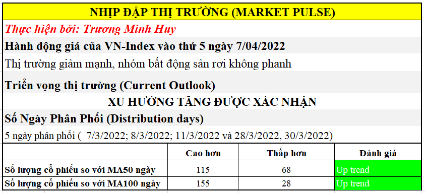 Khối lượng giao dịch của sàn Hose thấp hơn phiên trước nên Vn-Index tránh được ngày phân phối. Hiện VN-Index có 5 ngày phân phối. Tuy nhiên, thêm 3-4 phiên giao dịch nữa, ngày phân phối 7/3/2022 và 8/3/2022 sẽ được loại bỏ do thời gian trôi đi. Khi đó, số ngày giao dịch của VN-Index sẽ giảm mạnh.