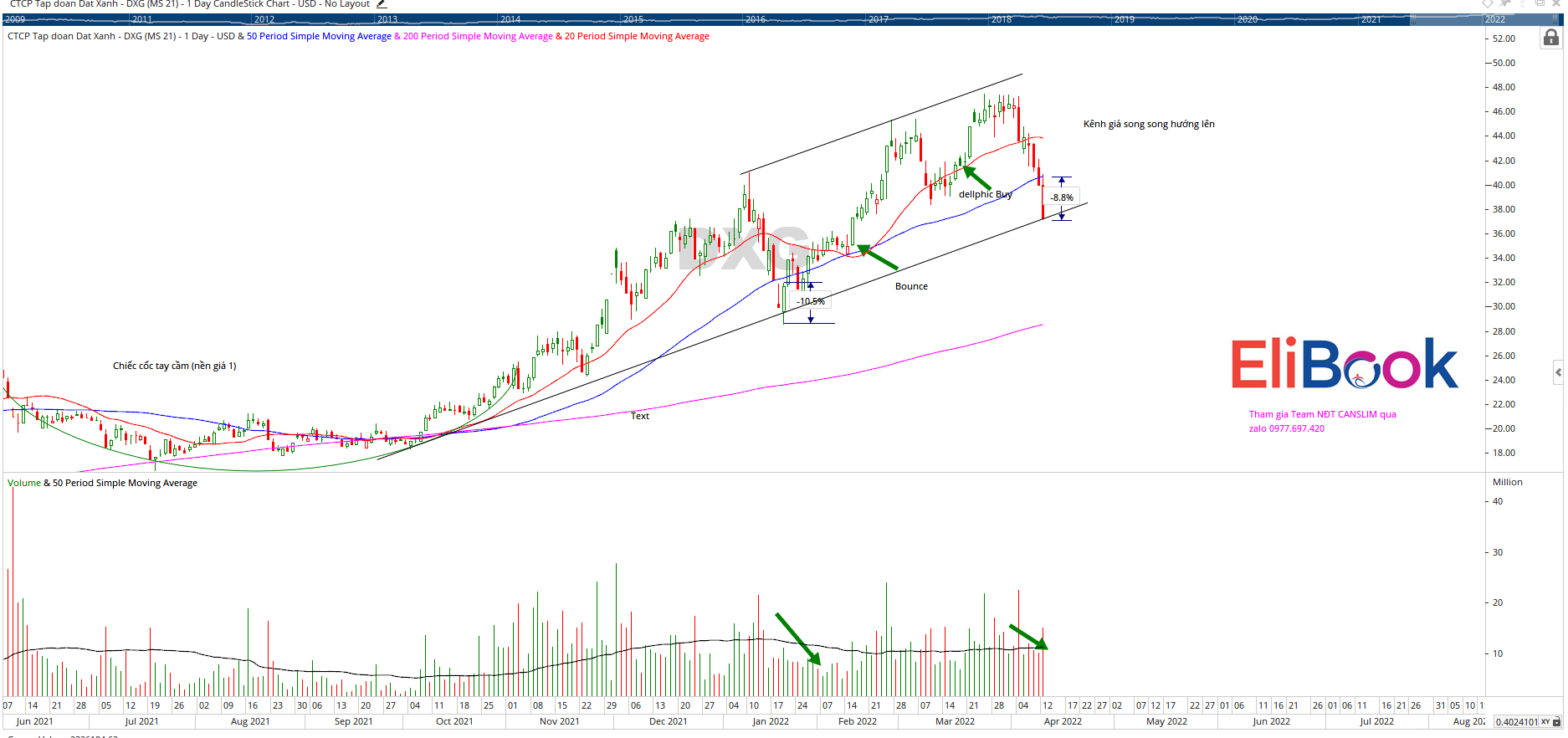 Nhưng thực tế thị trường đang kém hơn so với kỳ vọng. Hàng loạt cổ phiếu leader đã có điểm breakout thất bại khi giá nằm thấp hơn điểm pivot. Hôm nay. DXG nằm sàn-7% và thủng MA50 ngày ngày thứ hai liên tiếp. Tôi quan sát độ nhiễu của DXG đối với MA50 ngày trong đợt đáy tháng 1.2022 là khoảng -10%. Hiện nay, DXG nằm thấp hơn -9% so với MA50 ngày, vì thế nhà đầu tư cần kiên nhẫn hơn với DXG khi cổ phiếu này chạm vào đường xu hướng dưới của kênh giá song song hướng lên.